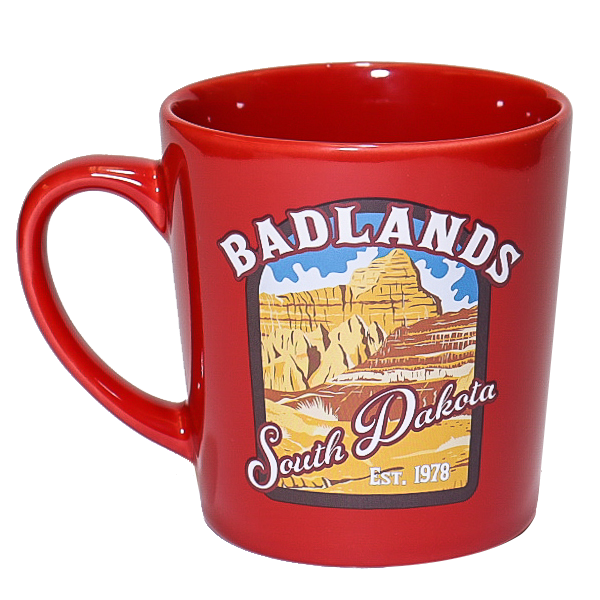 Bring a touch of South Dakota's iconic landscape to your daily coffee routine with this vibrant red mug. Featuring the stunning Badlands imagery, this ceramic mug holds your favorite hot beverages in style. A great souvenir or gift for Badlands enthusiasts and South Dakota travelers alike.