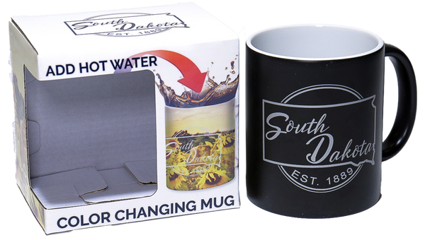Add hot coffee or tea to this mug and watch a golden sunflower field bloom before your eyes. The heat-sensitive design captures South Dakota's natural charm in vivid color, then disappears as your drink cools. A delightful way to start each day.