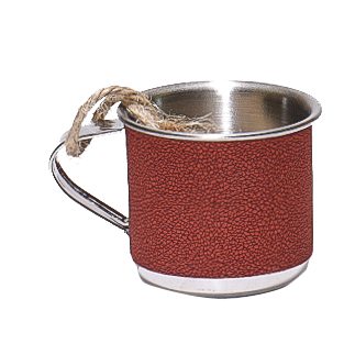 Vintage-inspired 5 cent coffee cup ornament featuring a metal cup with faux leather wrap and rope hanger. This charming Wall Drug collectible brings nostalgic Americana to your tree. Available in green, brown, blue, and red.